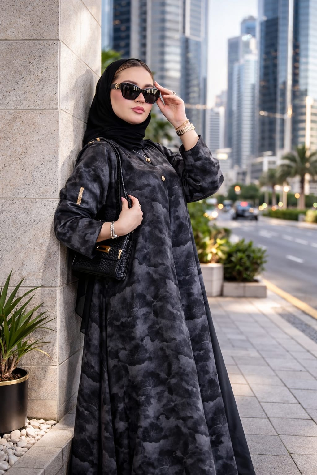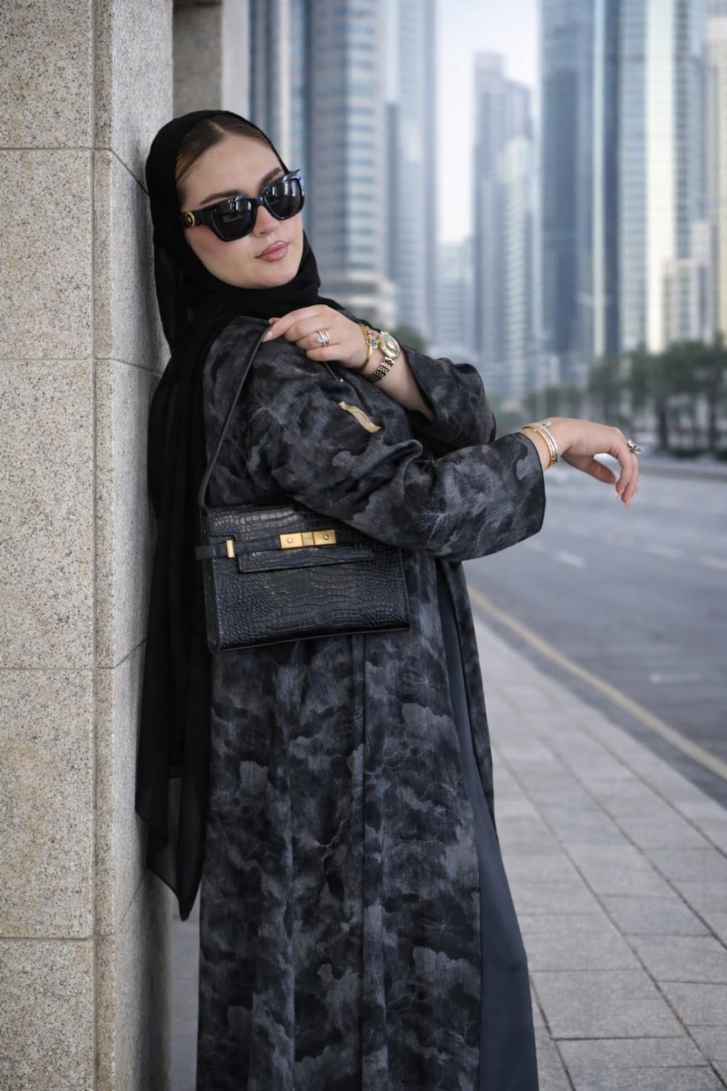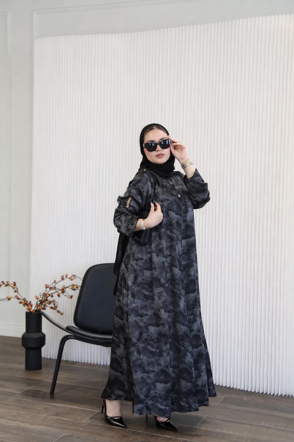 تألقي بإطلالة تجمع بين الفخامة والبساطة العصرية مع هذه العباية المميزة بتصميمها الانسيابي ونقشتها الراقية بدرجات الأسود والرمادي.
